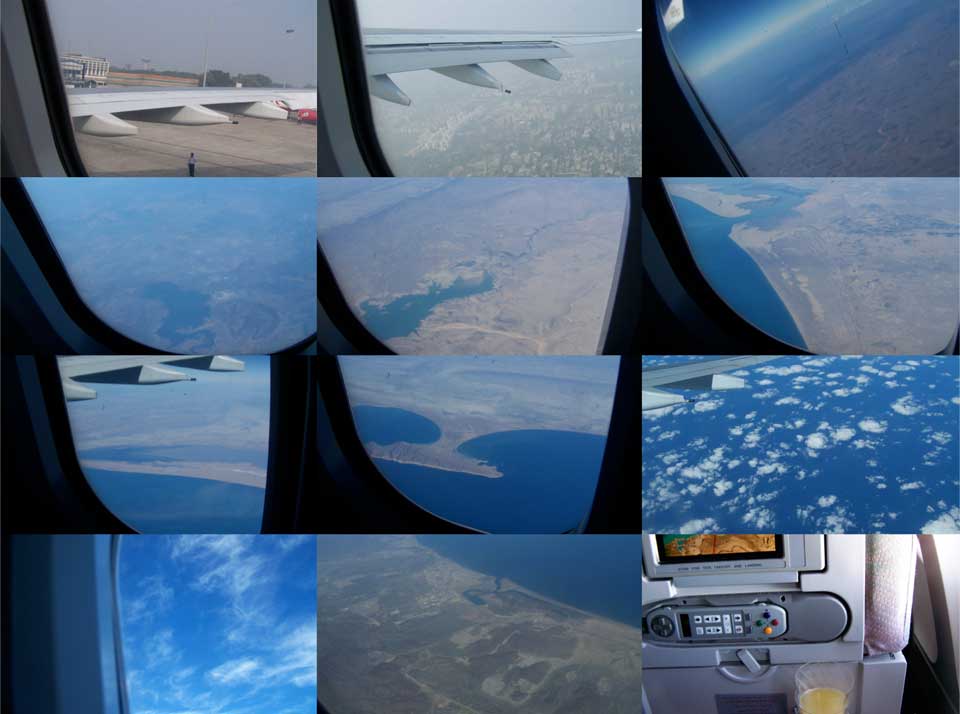 The flight from to Dubai last for five hours. westwards observing the geography of north India (the Rajasthan region), the cities some years before (Jaipur, Udaipur), the seafront of Pakistan and Iran. The aircraft start descending over the gulf of Oman toward the new Dubai airport (Paul Andreu arch.). The sky is cloudy, thus the biggest building in the world (2008, Burj Dubai) looks as if it penetrates the sky.
