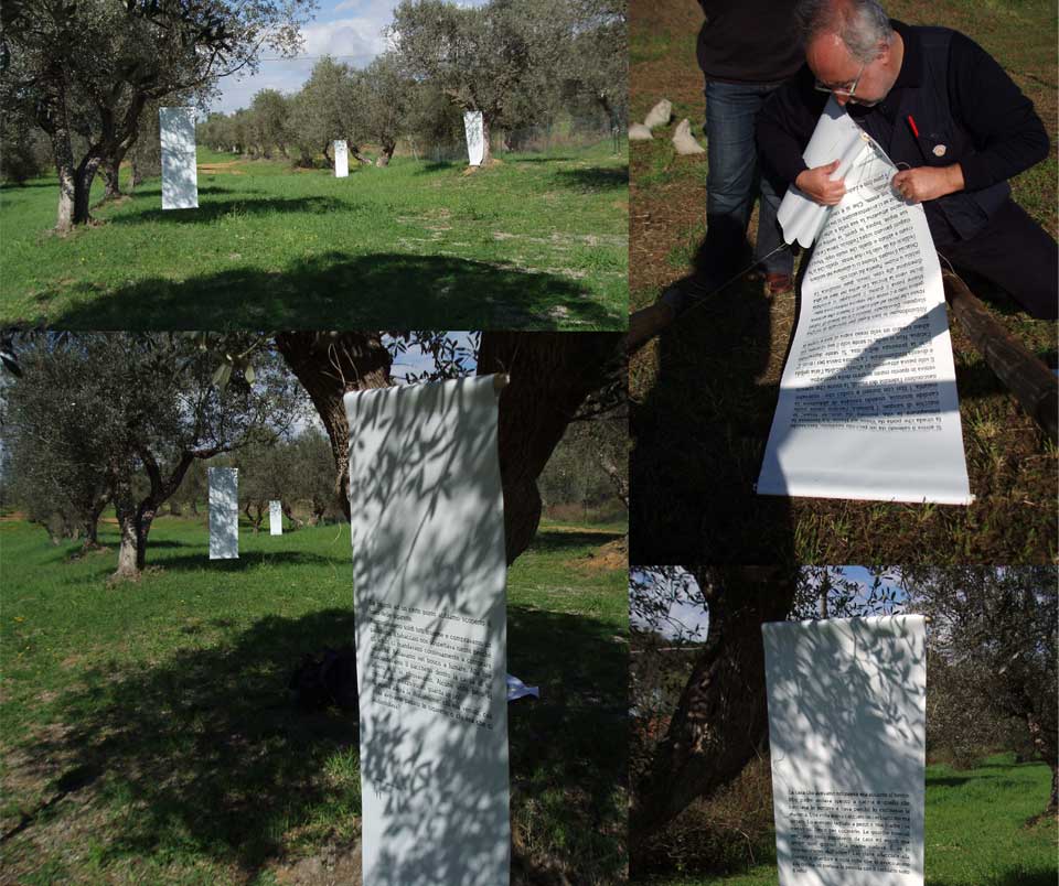 The collected stories were printed in cloth and hung by wooden poles in the field, like strange fruits of an earth that is formed in the ocean of the ideological versions of every artistic gesture. They can be gathered by the visitor, they can satisfy his hunger, they can annoy her, they can make him tell his own story, or they can –much later- in a distant land from the ones that bore and put them up, encourage them to construct their own analogy of the project. In this way the ideal visitor of the site may fill a piece of earth with the way and variations of a life lived. This ideal but simultaneously hidden artistic act, the diffusion of a life on the earth surface holds a big part in the wishes of the operators and carriers of these fifteen stories.