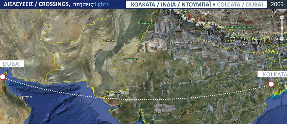 Η πτήση από την (Καλκούτα) έως το Ντουμπάι διαρκεί περίπου πέντε ώρες. δυτικά εποπτεύοντας την βόρεια Ινδία (Ρατζαστάν), τις πόλεις που χρόνια πρίν (Τζαϊπούρ, Ουνταϊπούρ), τις παράκτιες περιοχές του Πακιστάν και του Ιράν. Πάνω από τον κόλπο του Ομάν αρχίζει η κάθοδος προς το αεροδρόμιο στο Ντουμπάϊ (Paul An- dreu arch.). Ο ουρανός είναι συννεφιασμένος. Έτσι, το ψηλότερο κτίριο στον κόσμο (2008, Burj Dubai) φαίνεται να διαπερνά το επίπεδο των σύννεφων, προς τα όρια του ουρανού.