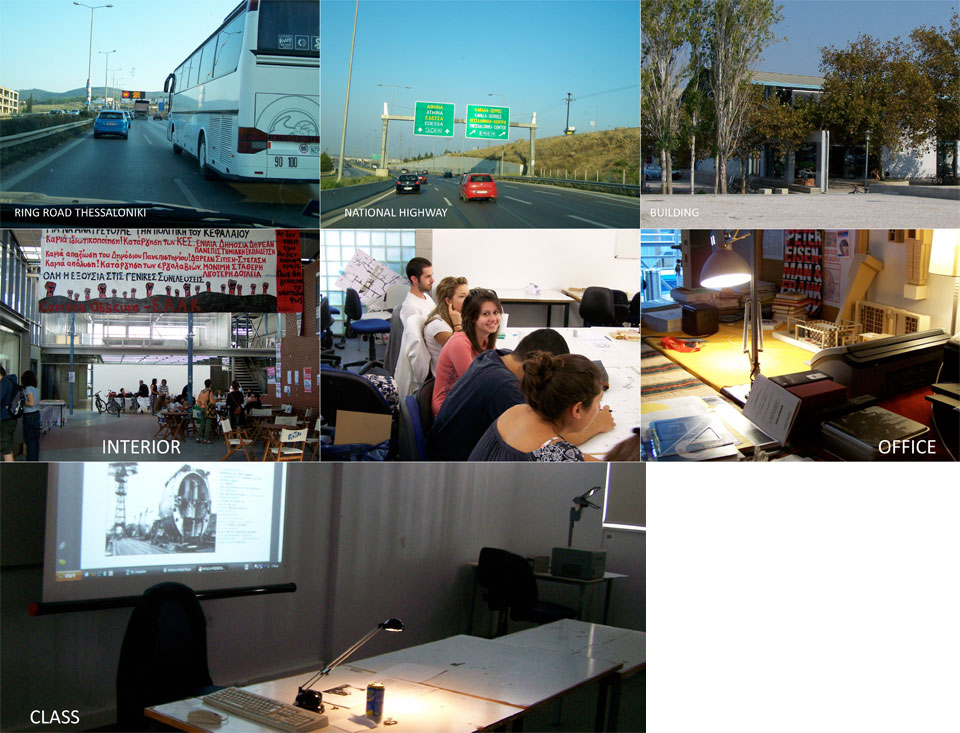 HELLINIKA Πρωϊ, 08.00. Το ταξίδι προς την πόλη του Βόλου θα διαρκέσει περίπου δύο ώρες (210 χμτ.)* Ταξιδεύουμε, εγώ και ένας συνάδελφος στην κύρια εθνική οδό της Ελλάδος. Συνήθως οι φοιτητές/τριες φτάνουν στις 10.30 και οι αίθουσες γεμίζουν. Την Τετάρτη 30 09 09 θα πρέπει να παρουσιάσω το περιεχόμενο ενός ειδικού συνθετικού μαθήματος Σχεδιασμού με τίτλο "Mechanization takes Command in the age..." και ύστερα, μαζί με τρείς ακόμη συναδέλφους να υποδεχτούμε τους νέους φοιτητές/τριες στο πρώτο έτος. Θα ακολουθήσει μια συζήτηση για την εκπαίδευση και την Αρχιτεκτονική και ύστερα θα παρουσιάσουμε το πρώτο τμήμα μιας σειράς παρουσιάσεων για τις τεχνικές ανάγνωσης μιας πόλης. Ασκήσεις, βιβλιογραφία και ορισμένα λογοτεχνικά βιβλία που θα επιταχύνουν το ενδιαφέρον των παιδιών. Αυτή την εβδομάδα η σχολή θα κλείσει τις δυο τελευταίες ημέρες εξαιτίας των εθνικών εκλογών. Το βράδυ θα επιστρέψω στην Θεσσαλονίκη. Θα δειπνήσω σε ένα εστιατόριο στην εθνική μαζί με δύο ακόμη συνάδελφους.