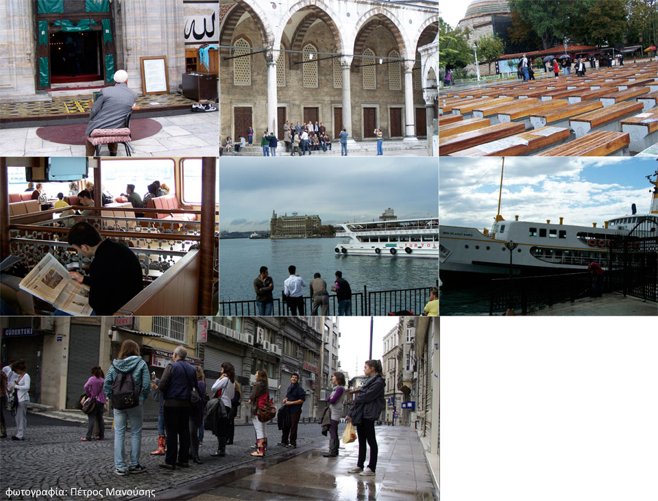 HELLINIKA Προτιμήσαμε να περπατήσουμε μακριά από την μεγάλη λεωφόρο που οδηγούσε στα Μνημεία, τους τόπους όπου μαρτυρούνται οι θριάμβοι και οι σφαγές, όλα εκείνα τα αφόρητα στιγμιότυπα της Ιστορίας. Προτιμήσαμε ένα κατηφορικό πέρασμα προς τη θάλασσα, την μικρή ήσυχη αυλή του Τεμένους όπου ένα μοναχικό βλέμμα διευθύνεται ακριβώς στο μοναδικό σημείο ενδιαφέροντος. Την ησυχία της Παρασκευής ή του Σαββάτου δίπλα από τα βαριά τείχη και τις σειρές από τα έρημα απομεινάρια χώρων, τις λίμνες του νερού, τα υπόστεγα που μας φιλοξένησαν όταν δυνάμωσε η βροχή. Το σώμα έμεινε ακίνητο καθώς το πλοίο διέσχιζε τον Βόσπορο προς την Ασιατική ακτή. Μια σύντομη χειρονομία ονόμασε αυτή την τελετή και την τακτοποίησε στη μνήμη. Λίγο πριν, ανάμεσα στα δύο μνημεία που σηματοδότησαν τις μακρές εποχές της βίας, μείναμε για λίγο σκεπτικοί, ευχαριστημένοι, κατανοώντας πως σε αυτό το δημόσιο υπαίθριο καθιστικό μπορούμε να παραμείνουμε. Κοιτώντας προς την Ανατολή ή τη Δύση χωρίς καμμία ενόχληση.