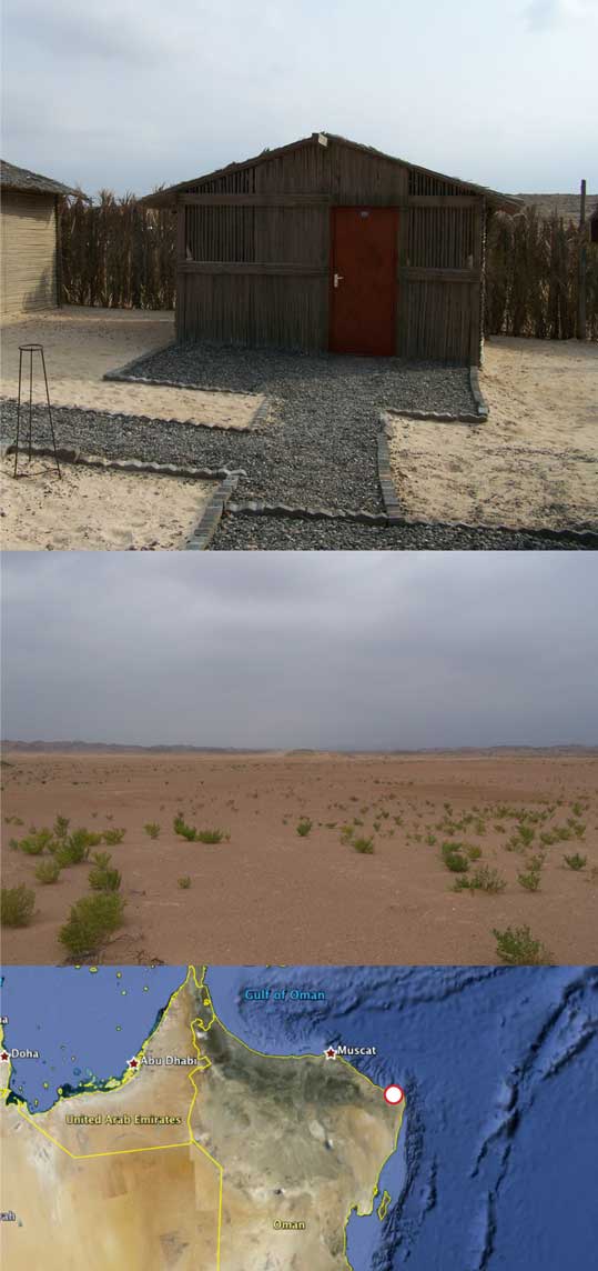 Στην άκρη της ερήμου του Ομάν, στο παλιό βρεταννικό αεροδρόμιο στο Rash al Hadd, στην ακτογραμμή, θα παραμείνω αρκετές ημέρες κοιτώντας εντατικά προς την Αραβική θάλασσα, περιμένοντας τις εκδηλώσεις του λαμπρού ή του ανταριασμένου ουρανού, της ήσυχης ερήμου. Η καλύβα μου είναι κατασκευασμένη από διπλή σειρά από πλεκτά καλάμια. Η στέγη καλύπτεται από ένα πρόσθετο φύλλο κερωμένου μουσαμά. Γύρω της απλώθηκε άμμος που ισοπεδώνεται τακτικά, κάθε πρωΐ. Διάδρομοι από χαλίκι οδηγούν στην είσοδο κάθε καλύβας που είναι στρωμένη με το ίδιο υλικό.