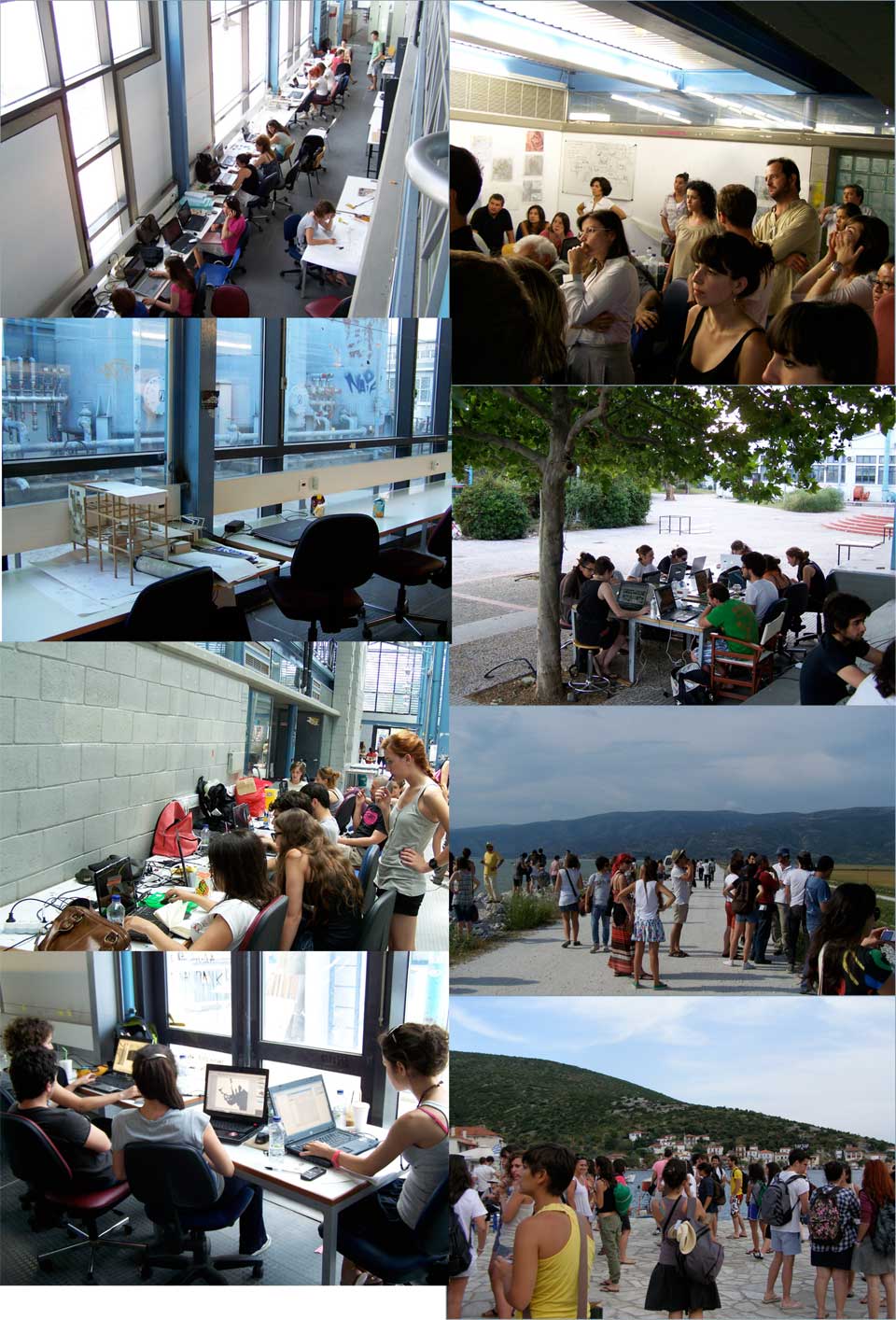 The workshop took place at the city of Volos, at the prefecture of Magnesia, and has been hosted by the department of Architecture of the University of Thessaly. The five project and survey areas were situated at the wider territory of the prefecture. Almost a hundred students and twenty professors were participated in the workshop coming from Portugal, Argentina, Spain, Italy, Greece, Morocco, Cyprus, the States, Mexico and Germany. Ten days of constant work, research, design, presentations and long discussions. An ideal expressive-educational field.